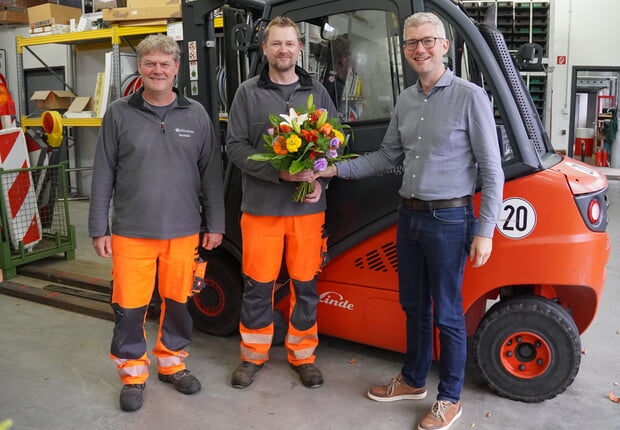 Mitte September hat Simon Wiethölter als neuer Mitarbeiter im Bauhof angefangen. Nun wurde er von dem stellvertretenden Bauhofleiter Stefan Mayer (links) und Bürgermeister Michael Tauch (rechts) mit einem bunten Blumenstrauß überrascht. Herzlich willkommen im Team.