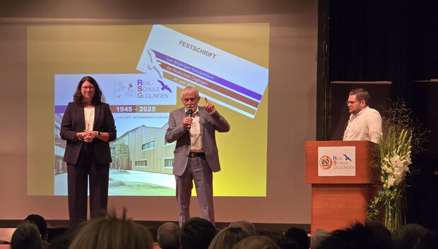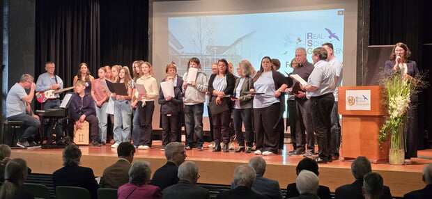 Neben musikalischen Beiträgen des Schüler- und Lehrerchores trug Altrektor Klaus Pfeil amüsante und heitere Geschichten der Realschule Güglingen vor und kombinierte dies damit, dass er die 80-jährige Entwicklungsgeschichte der Realschule Güglingen von 1945 bis 2025 entlang eines Luftbildes aufzeigte und jeweils passenden Anekdoten beisteuerte. Anschließend stellte Rektorin Sandra Stahl das aktuelle Konzept der Realschule Güglingen vor. DAbei wurde ein topaktueller Schulfilm der RSG uraufgeführt, der die vielfältigen Facetten des Schullebens zeigt. Alle Festredner betonten, dass die Realschule sich immer adäquat weiterentwickelt und sich den jeweils aktuellen Zeiterfordernissen gestellt hat. Daher wird sie auch den kommenden Herausforderungen angemessen begegnen und diese meistern. Die Stadt Güglingen und die gesamte Region Zabergäu kann zurecht stolz sein auf diese Realschule, was auch durch die Anwesenheit verschiedener Repräsentanten der Güglinger Betriebe unterstrichen wurde – man meinte etwas augenzwinkernd gar das gesamte „Who is who des Zabergäus“ an diesem Abend in der Herzogskelter versammelt zu haben. Die Wirtschaft und Gesellschaft der Region hat seit 80 Jahren sehr von den vielen Generationen an Absolvent(inn)en der Realschule Güglingen profitiert. Daher wurde die geleistete Arbeit an diesem Abend mit viel Dank und Respekt gewürdigt.