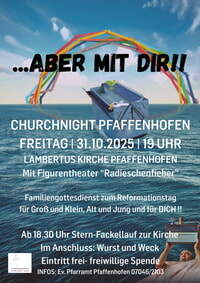19.00 Uhr Gottesdienst zur Churchnight, mit Prädikant Maurer und dem Figurentheater „ Radieschenfieber“, in der Lambertuskirche Pfaffenhofen, anschl. Wurst und Weck und Punsch.