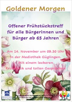 ab 9.30 Uhr laden das Familienzentrum und die Mediothek Güglingen herzlich alle Bürgerinnen und Bürger ab 65 Jahren zu unserem nächsten "Goldenen Morgen" ein.