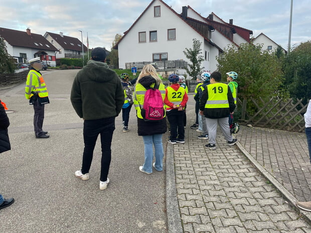 Am Mittwoch, 22.10.25, haben die Kinder aus den vierten Klassen der Grundschule Pfaffenhofen ihre Radfahrprüfung abgelegt. Zuvor mussten alle zweimal auf den Verkehrsübungsplatz in Eibensbach und einmal im Wohngebiet Untere Gehrn üben. Alle Schüler und Schülerinnen brachten zum Fahren im echten Verkehr ihre Fahrräder und Helme mit. Die Klasse 4a startete um 8:00 Uhr und die Klasse 4b um 9:30 Uhr. Trotz Kälte und vieler Pfützen haben alle Kinder mit Erfolg bestanden. Sie erhielten alle ihren Fahrradführerschein und einen grünen Aufkleber. Es war ein wirklich toller Tag. Ein großes Dankeschön geht an die hilfsbereiten Eltern, dass sie sich freiwillig Zeit nahmen. Auch bedanken wir uns bei den netten Polizisten und unseren Lehrern. Wir dürfen nun endlich auf der Straße fahren. Also Achtung - wir kommen!