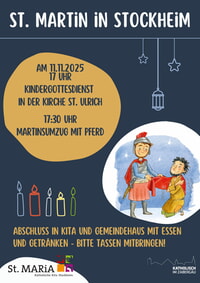 Am Dienstag, 11.11. findet unser St. Martinsfest in Stockheim statt. Beginnen werden wir um 17 Uhr in der Kirche St. Ulrich mit einem Kindergottesdienst. Gegen 17.30 Uhr startet der Laternenumzug mit musikalischer Begleitung der Jungbläser des Musikvereins Brackenheim. Ebenso begleitet uns St. Martin auf einem Pferd und die Legende wird in einem kurzen Anspiel erzählt. Anschließend sind alle Teilnehmer ins Gemeindehaus eingeladen. Dort gibt es Glühwein- und Punsch Ausschank, sowie Putensaiten-Weckle, Hefezopf und Muffins. Der Gesamterlös wird zu gleichen Teilen der Tafel, sowie der Kita St. Maria Stockheim gespendet.