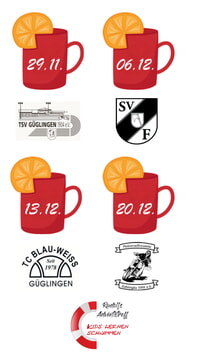 Die Bewirtung an den vier Adventssamstagen stemmen die Vereine TSV Güglingen, SV Frauenzimmern, TC Blau-Weiß Güglingen und Motorradfreunde Zabergäu. Und so duftet es auch dieses Jahr wieder an jedem Adventssamstag von 12.00 – 21.00 Uhr vor der Mediothek in Güglingen nach Lemberger Glühwein, Früchtepunsch und knackiger Bratwurst. Bewährt hat sich auch die Zusammenarbeit mit den örtlichen Betrieben, die die Aktion gerne unterstützen. Den Lemberger Glühwein, Sekt und Secco liefern die C&G Winzer Cleebronn-Güglingen, dazu bäckt die Bäckerei Bürk die Brötchen und die Metzgerei Reinwald produziert die Bratwürste. Es gibt auch Bier und alkoholfreie Getränke.