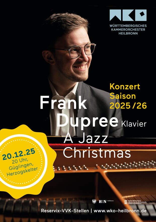 Es ist eine liebgewordene Tradition: Seit 1982 tritt das Württembergische Kammerorchester Heilbronn in der Herzogskelter in Güglingen kurz vor Weihnachten auf. Auch dieses Jahr spielen die Musiker in bewährter Manier am Samstag, 20. Dezember, 20 Uhr, „A Jazz Cristmas“. Dieses Mal unterstützt das Frank Dupree Trio das Ensemble bei seinem etwas anderen Weihnachtsprogramm. Der vielseitige Pianist, Schlagzeuger und Dirigent Frank Dupree ist bekannt für seine Fähigkeit, Grenzen auszuloten und zu überschreiten und hat das Programm extra für diesen Anlass entworfen. Karten gibt es im Bürgerbüro des Rathauses oder über reservix.de