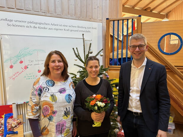 Stefanie Horvath unterstützt seit Anfang Dezember das Team der Kita Heigelinsmühle. Willkommen im Team. Bürgermeister Michael Tauch und die Kita-Leiterin Natalie Krippl haben die neue Kollegin mit einem Blumenstrauß überrascht.