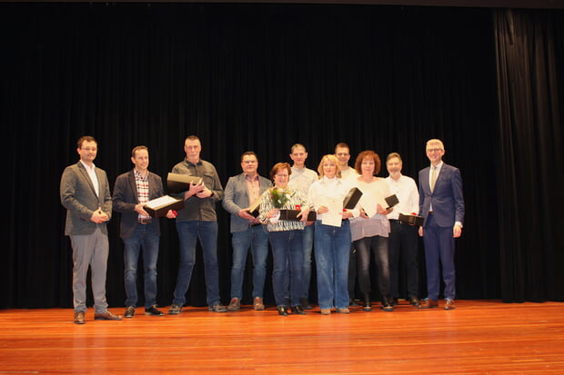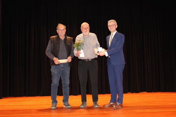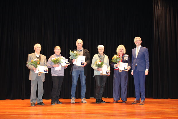 Neben den beiden ehemaligen Gemeinderäten wurden auch Ehrenamtliche aus Vereinen mit einer goldenen Verdienstmedaille geehrt. Mit Heinz Conz wurde der ehemalige Oberschützenmeister des Sportschützenvereins für sein 26 Jahre langes Engagement ausgezeichnet. Mit den Worten „neben Heinz Conz hat sich noch eine weitere Person für die Modernisierung und den Umbau des Geländes des Sportschützenvereins engagiert“, rief der Bürgermeister auch Helmuth Barth auf die Bühne. Helmuth Barth erhielt ebenso wie Roland Baumann keine weitere Medaille, sondern einen Gutschein für die Herzogskelter.