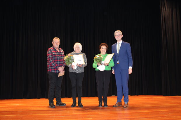 Mit Renate Beck betrat die erste Ehrenamtliche die Bühne. Michael Tauch ehrte Renate Beck mit einer bronzenen Verdienstmedaille für ihr Engagement im Liederkranz Frauenzimmern als zweite Vorsitzende von 2003 bis 2006, als Beiratsmitglied und Notenwartin. Ebenfalls die bronzene Verdienstmedaille erhielt Helga Baumann. Sie ist Beisitzerin im Verein „Partner in Europa“. Als fleißige Helferin ist sie nach wie vor aktiv. „Damit ermöglicht sie ihrem Verein Vieles“, so Michael Tauch. Neben Renate Beck und Helga Bauman bat der Bürgermeister auch Roland Baumann auf die Bühne. Roland Baumann war im Partnerschaftsverein lange Jahre Schriftführer und kümmert sich als „Quartiermeister“ immer noch um die Zuteilung der Gastfamilien. Da er bereits eine goldene Verdienstmedaille besitzt, konnte er nicht mit einer weiteren Medaille geehrt werden. Daher gab es für ihn lauten Applaus und einen Gutschein für die Herzogskelter.