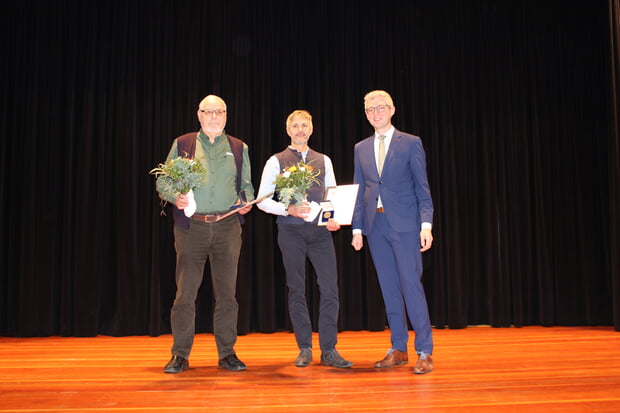 Mit Joachim Knecht und Friedrich Sigmund betraten im Anschluss zwei ehemalige Stadträte die Bühne. Sie erhielten für ihre mehr als drei vollen Amtsperioden im Gemeinderat die goldene Verdienstmedaille der Stadt Güglingen. Der Bürgermeister hob bei beiden ihr offenes Ohr für die Anliegen der Bürgerinnen und Bürger, das gute Miteinander und die aktive Mitarbeit im Gemeinderat hervor.