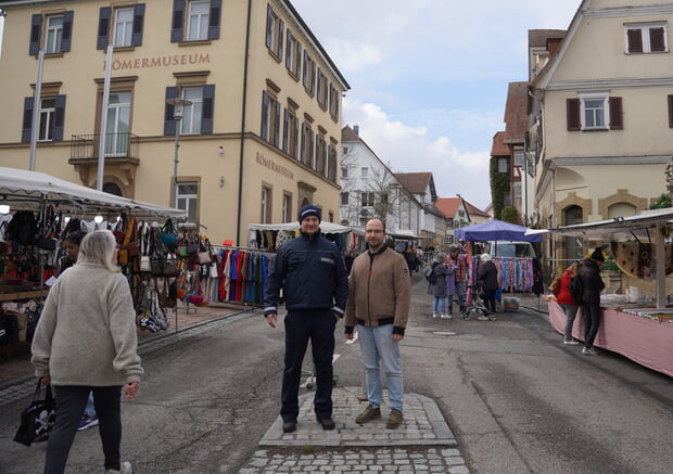 Unser neuer Marktmeister Benjamin Giebler (l.) hat seinen ersten Krämermarkt gut über die Bühne gebracht, hier begleitet von Patrick Fadda, dem Sachgebietsleiter Sicherheit und Ordnung/Bürgerservice. Der Markt konnte bei frühlingshaftem Wetter stattfinden. Die Gäste bummelten gern zwischen den Ständen und ließen sich zumeist zum Abschluss der Krämermarktrunde eine Grillwurst schmecken.