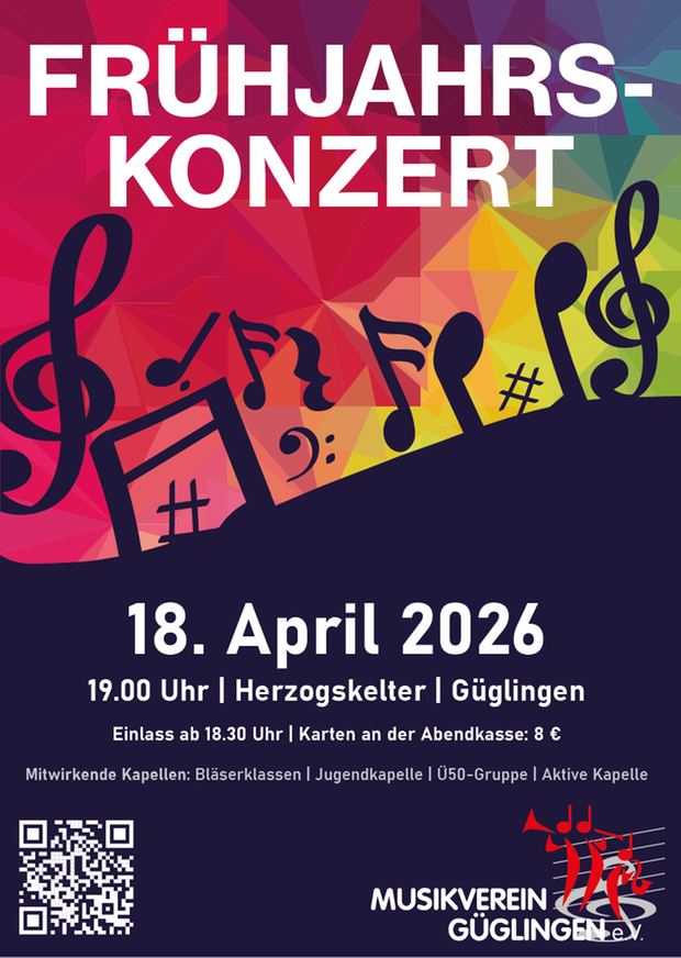 Am Samstag, den 18. April 2026, lädt der Musikverein Güglingen herzlich zum diesjährigen Frühjahrskonzert in die Herzogskelter Güglingen ein. Konzertbeginn ist um 19:00 Uhr, die Saalöffnung erfolgt bereits um 18:30 Uhr.
