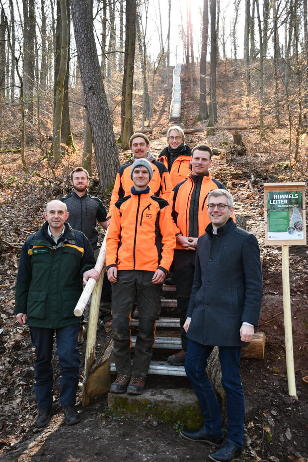 Die neue Himmelsleiter ist wieder eröffnet. Damit ist ein direkte Aufstieg zur Burgruine Blankenhorn nun wieder möglich. Rund 700 Stunden haben Forstwirte des Forstreviers Stromberg-Heuchelberg gemeinsam mit Forstwirt-Auszubildenden des Forstreviers Stifterhof bei Östringen gearbeitet, damit die 210 Stufen wieder erklommen werden können. Bei dem Aufstieg werden gut 80 Höhenmeter zurückgelegt. Die neuen Treppenstufen bestehen aus Stahl und sind robuster bei geringerer Rutschgefahr. Die Seitenteile der Treppe bestehen auch Robinien- und Eichenholz. Die Kosten von rund 12.500 Euro plus Arbeitsstunden wurden von der Forst BW getragen. Forstbezirksleiter Christian Feldmann bedankte sich bei einem Vor-Ort-Termin mit allen Forstwirten für den Einsatz und das gemeinsame Arbeiten.