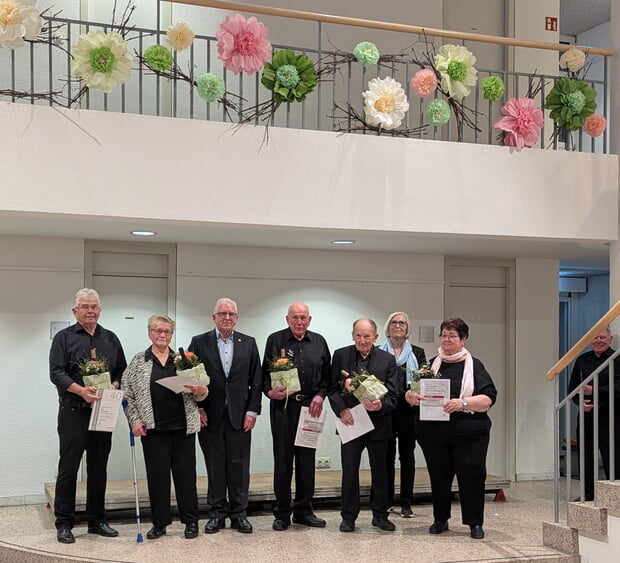 Gerhard Wörz für 40 Jahre, Sofia Hann für 40 Jahre, Emil Wildt für 60 Jahre, Karl Buchenroth für 65 Jahre, Gerda Hintz für 65 Jahre. Dritter von links Gerald Kranich. Dahinter Rosalinde Tietz, die Vorsitzende des Liederkranzes.