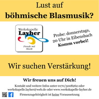 Du spielst ein Instrument und liebst böhmische Blasmusik? Dann bist Du bei uns genau richtig! Die Werkskapelle Layher sucht dringend Verstärkung - vor allem an der Trompete, am Flügelhorn, Tenorhorn und Bariton.