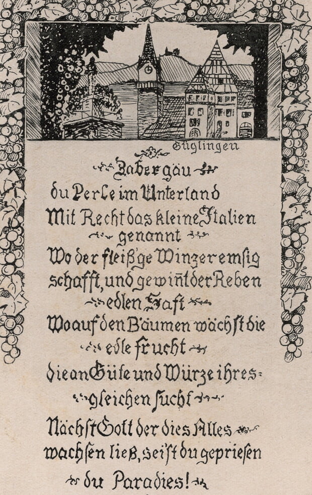 Unsere Archivarin Emma Koska hat einen wunderschönen Vers gefunden, den Dr. med. Karl Hoch an seinem Weinberghäusle am Heuchelberg anbringen ließ. Denn der angesehende Mediziner, der am liebsten von Güglingen nach Leonbronn mit der Bahn zu seinen Patienten unterwegs war, war auch leidenschaftlicher Landwirt mit einer großen Liebe zur Natur und zur Geschichte, der natürlich Mitglied im Zabergäuverein war. Er hat im Jahr 1928 im Güglinger Rathaus vorgeschlagen, einen Straßennamen nach dem Gründer des Zabergäuvereins Karl Klunzinger zu benennen, was auch geschah. Wer mehr über den beliebten Arzt wissen möchte, dem sei das Heft II des Zabergäuvereins vom Jahre 1935 empfohlen (online einsehbar auf der Vereinsseite). Dort erschien ein Nachruf, denn am 25. Januar 1935 ist Dr. Hoch verstorben.