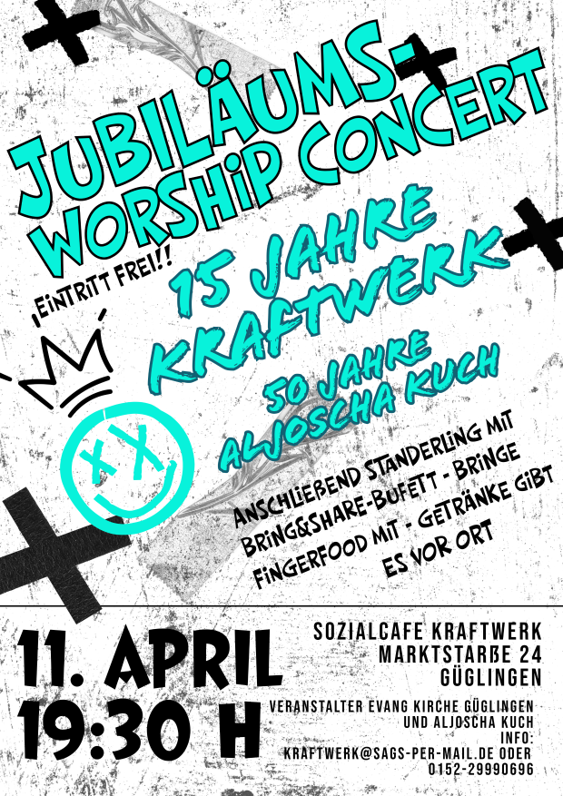 Wir feiern 15 Jahr Sozialarbeit im Kraftwerk. Dazu laden wir alle Freunde und Interessierte am 11. April um 19.30 Uhr zu einem Konzert mit moderner geistlicher Musik ein. Veranstaltungsort sind unsere Räumlichkeiten in der Marktstraße 24. Wir wollen Gott danken für das was in diesen Jahren an Positivem möglich war. Nach dem Konzert laden wir Sie zu einem Glas Sekt oder einem kalten Getränk ein.