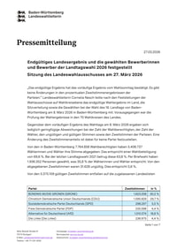 Das endgültige Landesergebnis und die gewählten Bewerberinnen und Bewerber der Landtagswahl 2026 ist bekannt und auf unserer Homepage unter Aktuelles zu finden.
